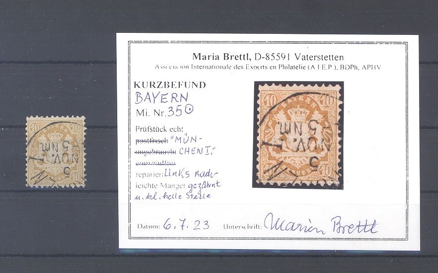 Bayern Michel Nummer 35, 10 Kreuzer Freimarke 1875 gestempelt, ausgebessert, optisch ein sehr ordentlicher Wert. Es liegt ein Befund BPP vor, hat bereits einiges gekostet, ist mit eingescannt.