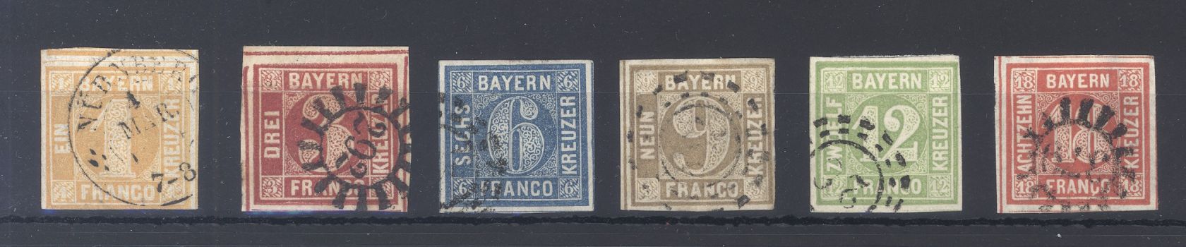 Bayern Michel Nummer 8/13, Freimarken 1862 komplett gestempelt, dabei auch ein Wert mit Ortsstempel.