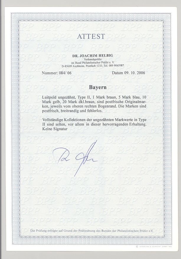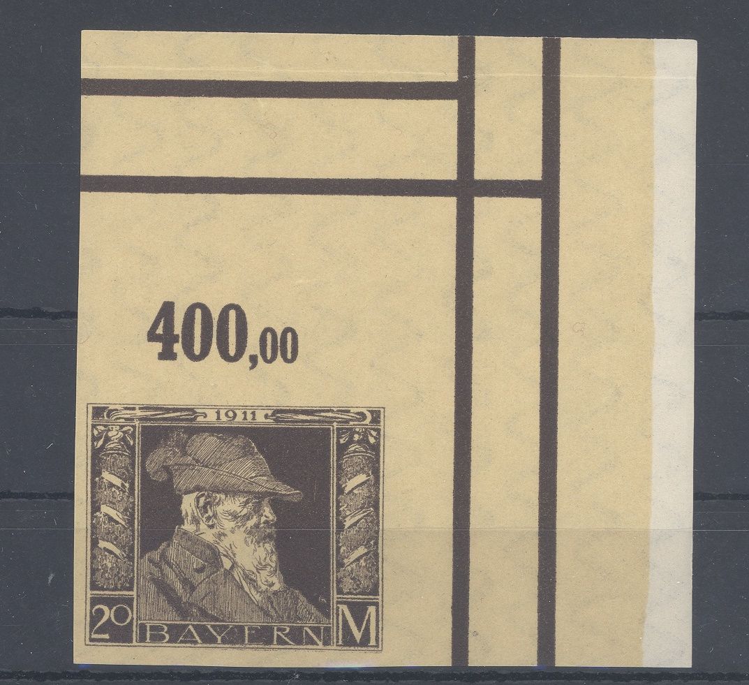 Bayern Michel Nummer 91 II, 20 Mark Freimarke 1911 ** vom Eckrand, helle Stelle im Eckrand, die Marke ist nicht betroffen. Es liegt ein FA Kopie BPP von einem aufgeteilten Attest mit vier Marken vor, ist mit eingecannt, selten einmal angeboten!