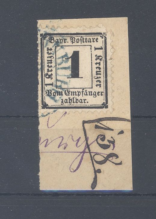 Bayern Porto Michel Nummer 2, 1 Kreuzer Freimarke 1870 gestempelt in Bedarfserhaltung mit auch einem Eckfehler auf Briefstück. Der Wert ist geprüft BPP, billigst.