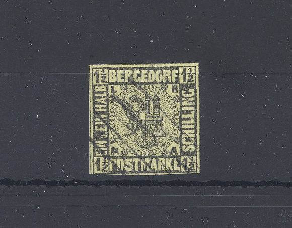 Bergedorf Michel Nummer 3, 1 1/2 S. Freimarke 1861 gestempelt mit einem senkrechten Bug, kann man auf dem Scan schlecht sehen, sonst ein ordentlicher Wert. Der Wert ist geprüft mit Altprüfung, selten einmal angeboten!