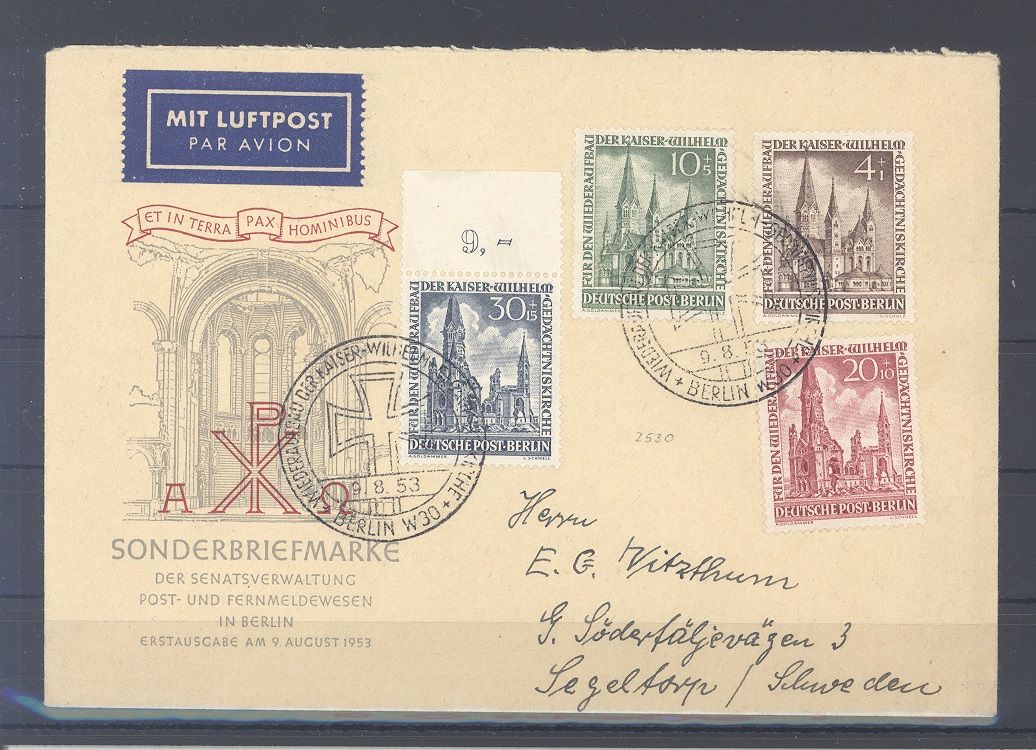 Berlin, sauberer FDC der Michel Nummer 106/09, Gedächtniskirche 1953.