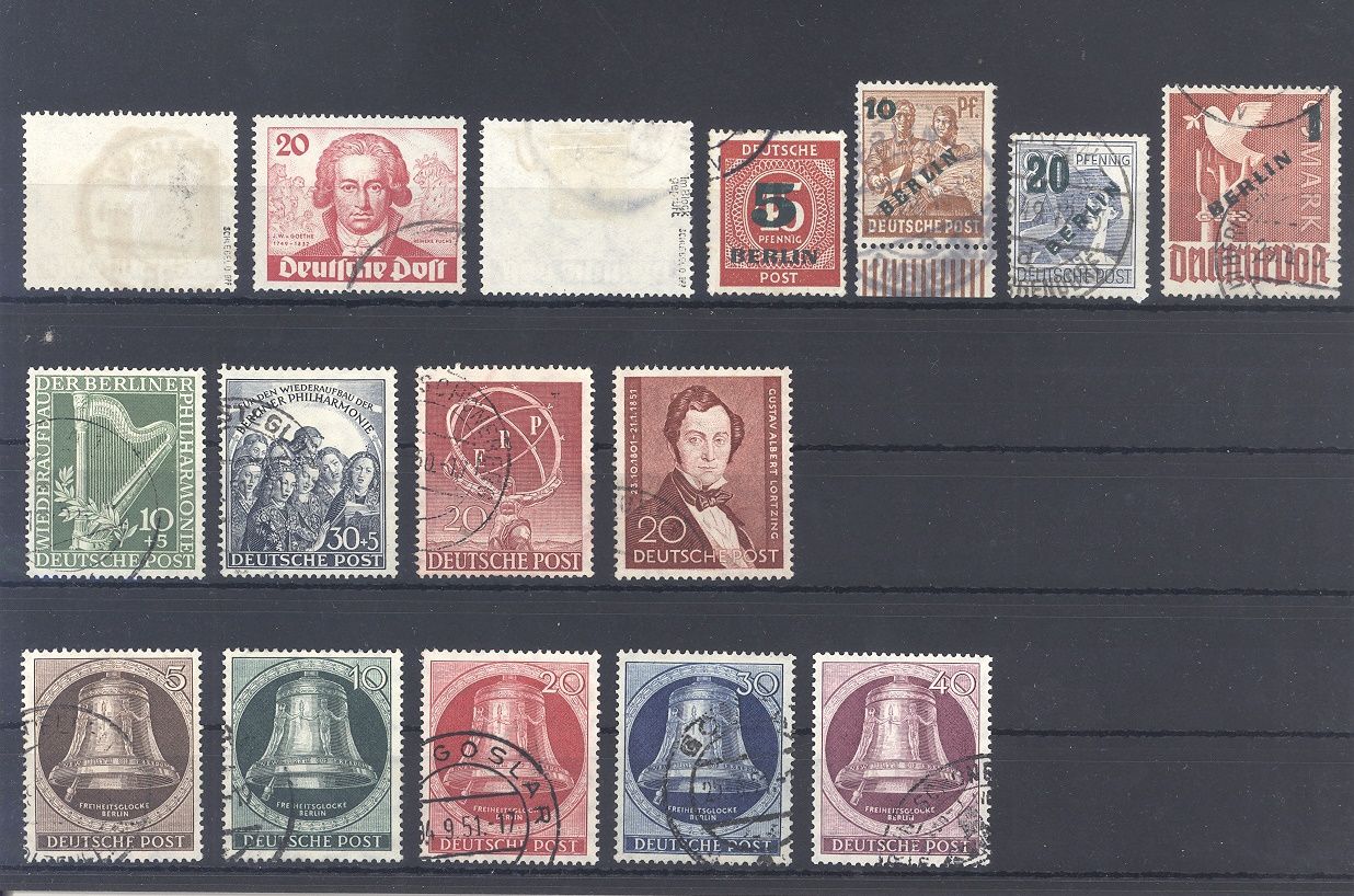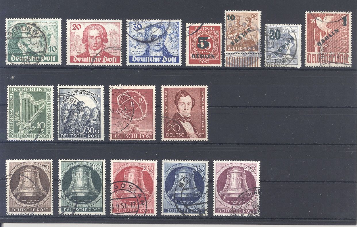 Berlin, gestempelter Posten aus den Jahren 1949/50 auf Steckkarte. Es sind die Michel Nummern 61/63, 64/67, 71, 72/73, 74 und 75/79 vorhanden. Die Michel Nummern 61 und 63 sind geprüft BPP.