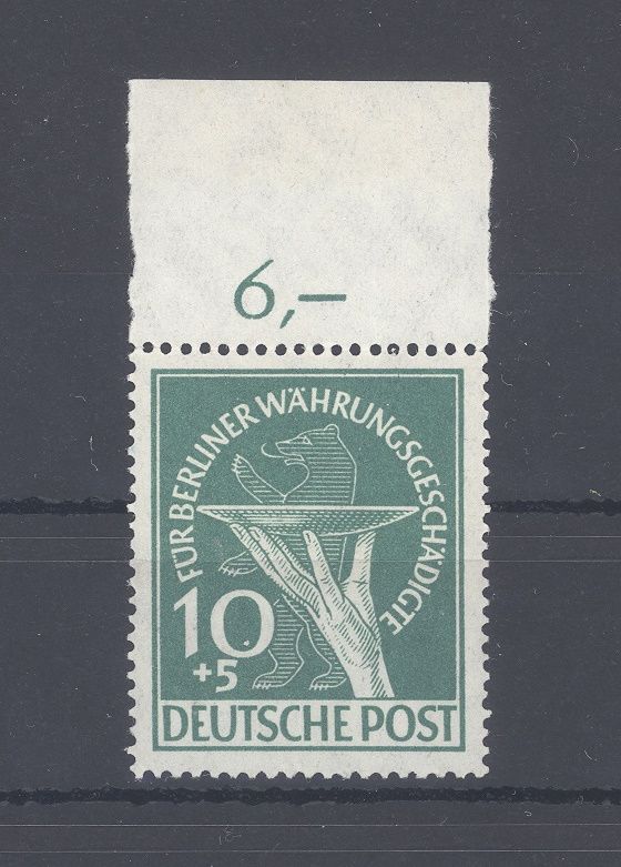 Berlin Michel Nummer 68 II, die 10 Pfg. Freimarke Währungsgeschädigte 1949 mit dem Plattenfehler II **, etwas bügig aber vom Oberrand,