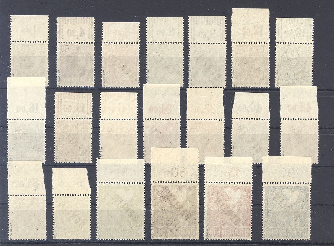 Berlin Michel Nummer 1/20, Schwarzaufdruck 1949 ** einheitlich vom Oberrand, teilweise vorgefaltet, teilweise ungefaltet wie auch die 2 DM. Jeder Wert ist geprüft BPP.