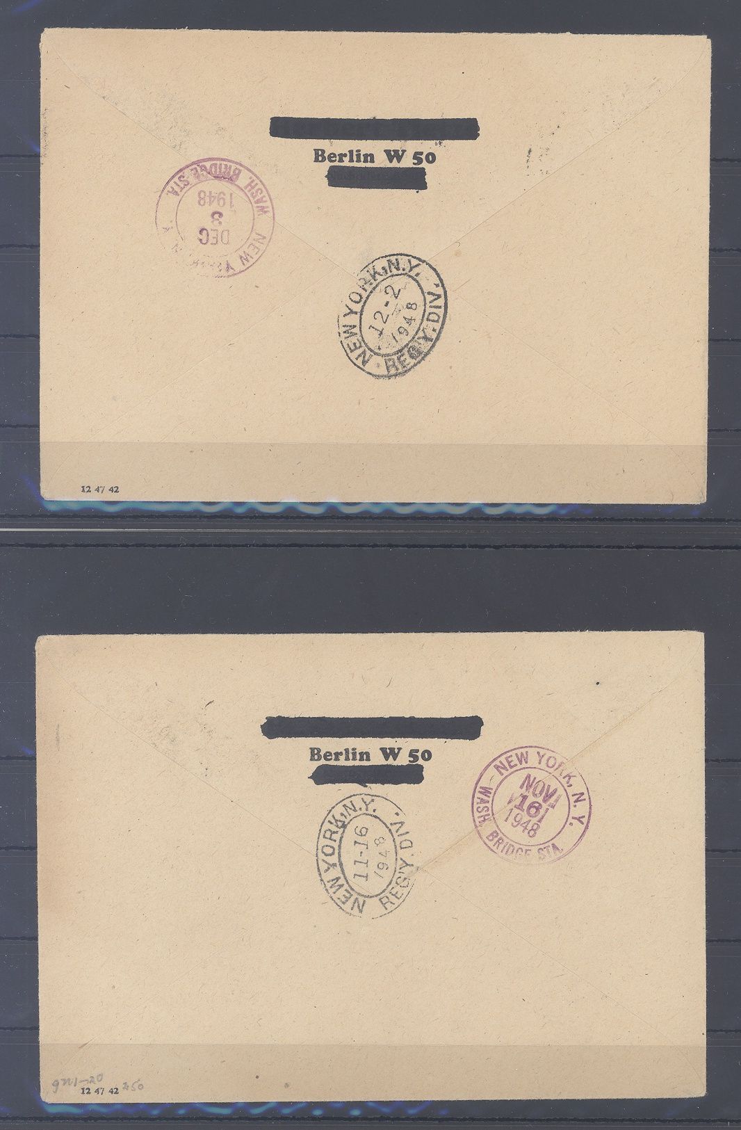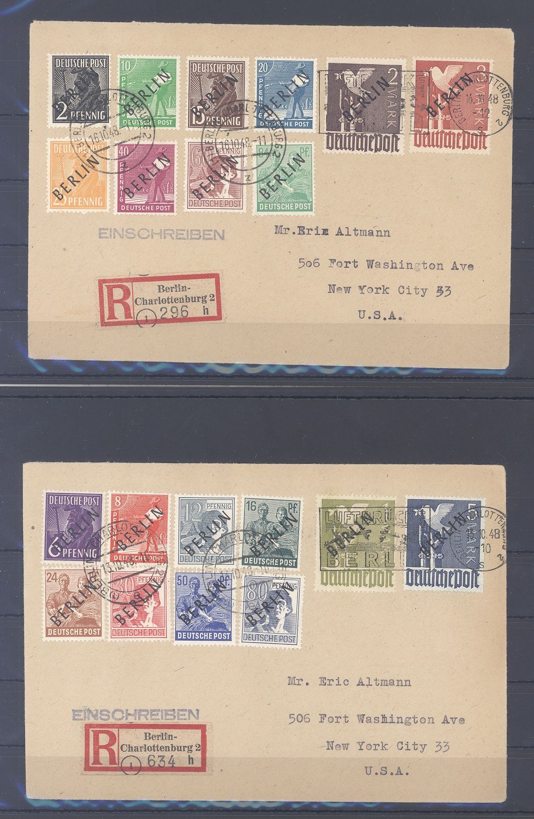 Berlin Michel Nummer 1/20, Schwarzaufdruck 1949 auf zwar überfrankierten aber echt gelaufenen Briefen in die USA mit rückseitigem Ankunftsstempel gelaufen, wunderbare Ergänzung zur Sammlung, der Michel für lose gestempelt beträgt bereits 2.400,00 Euro.