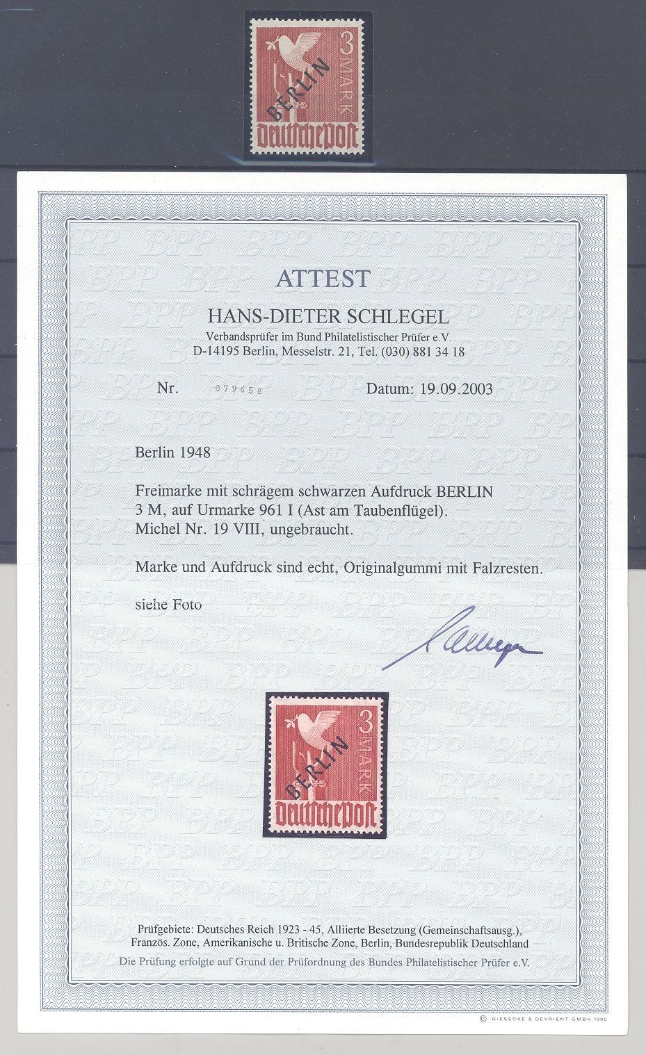 Berlin, Michel Nummer 19 VIII, 3 Mark 1948 ungebraucht * , ist heute Michel Nummer 19 I. Es liegt ein FA BPP vor, ist mit eingescannt, hat bereits einiges gekostet, es gibt nur einen Michel für ** mit 2.000,00 Euro.