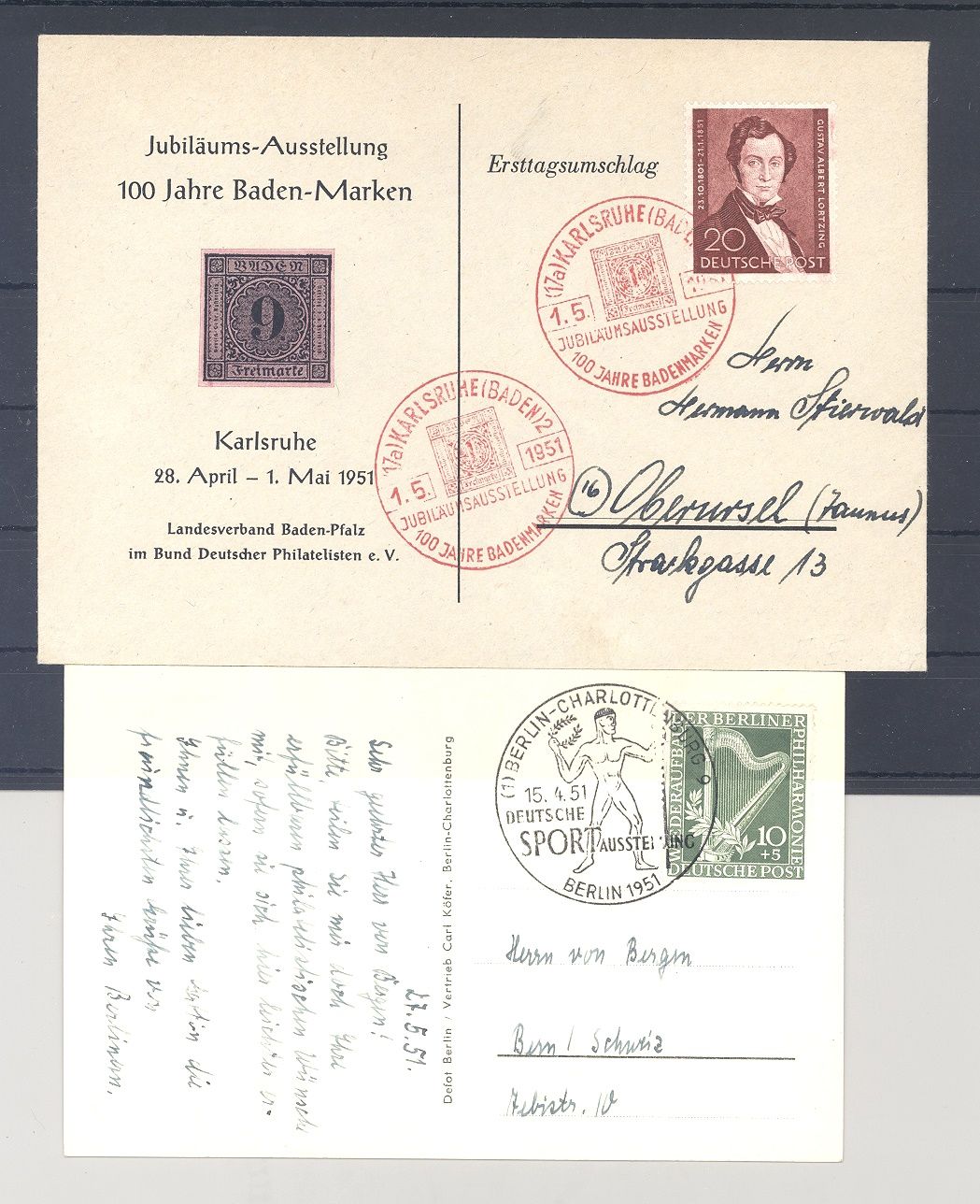 Berlin Michel Nummer 72 und 74, 10 Pfg. Philharmonie 1950 und Lortzing 1951 auf Beleg mit schönen SST. Nette Ergänzung zur Sammlung!