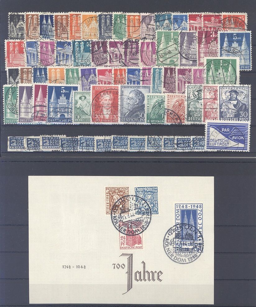 Bizone, gestempelter Posten aus Mi.Nr. 69/100 auf Steckkarte und einem Beleg. Dabei beide Bautensätze, Mi.Nr. 69/72 mit SST und Mi.Nr. 103/10. Sollte ein nettes Schnäppchen sein...