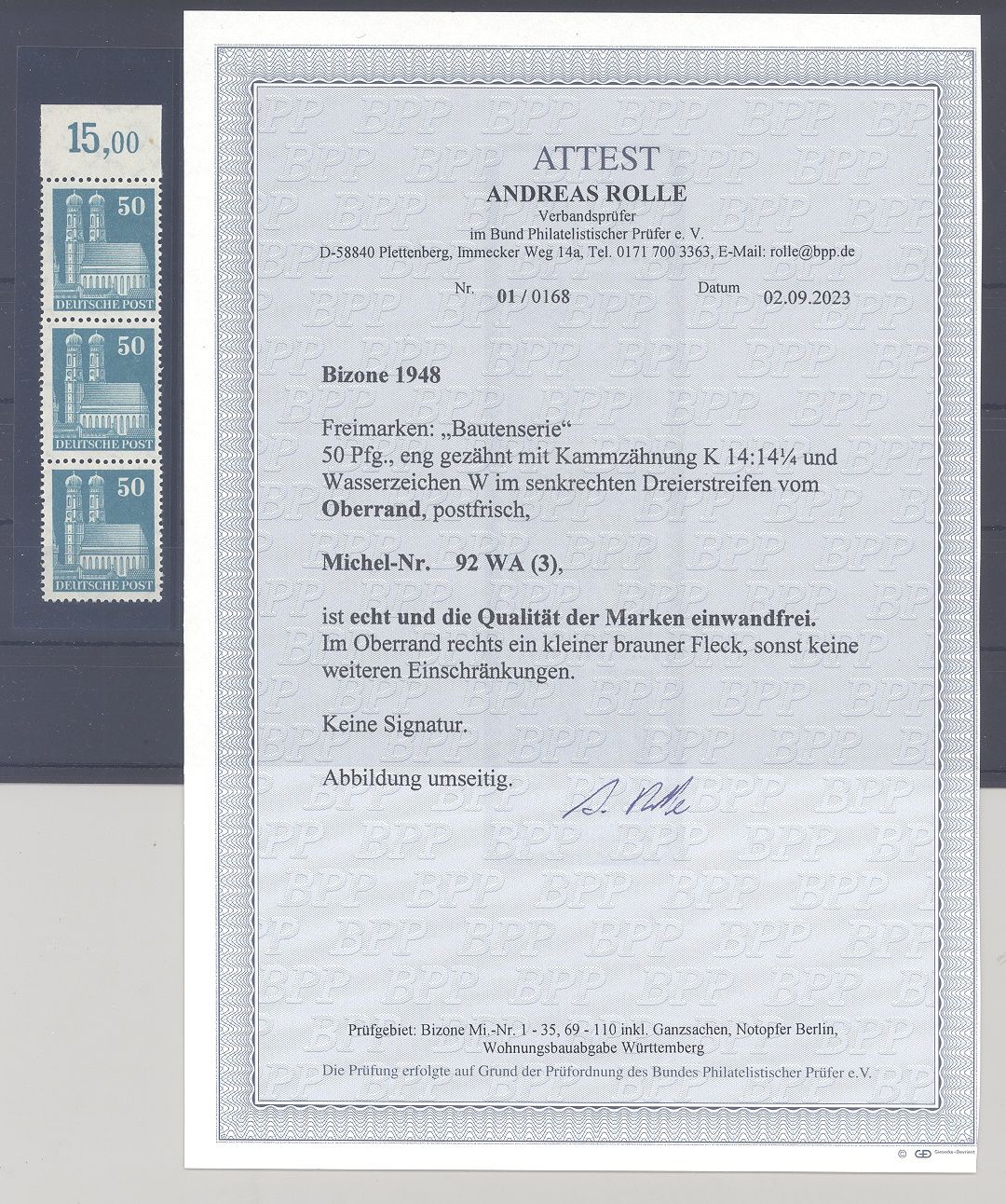 Bizone Michel Nummer 92eg, 90 Pfg .Bauten im ** Dreierstreifen. Es liegt ein FA BPP vor, hat bereits einiges gekostet, ist mit eingescannt.