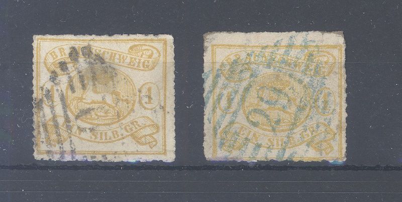 Braunschweig, 2 x Michel Nummer 14, 1 Sgr. Freimarke 1864 gestempelt, der rechte Werte hat m.E. gute Chancen, die bessere B Zähnung zu sein. Anschauen!