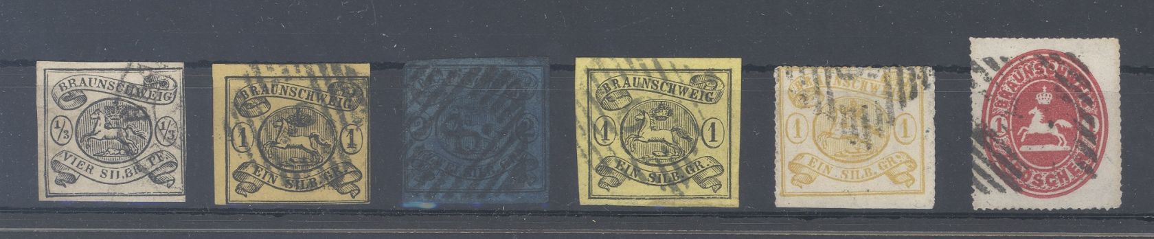 Braunschweig, sechs verschiedene gestempelte Werte als Posten. Es sind die Michel Nummern 5, 6, 7, 11, 14 und 18 vorhanden.