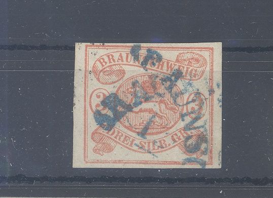 Braunschweig Michel Nummer 3, 3 Sgr. Freimarken 1852 gestempelt. Der Wert ist geprüft mit Altprüfung.