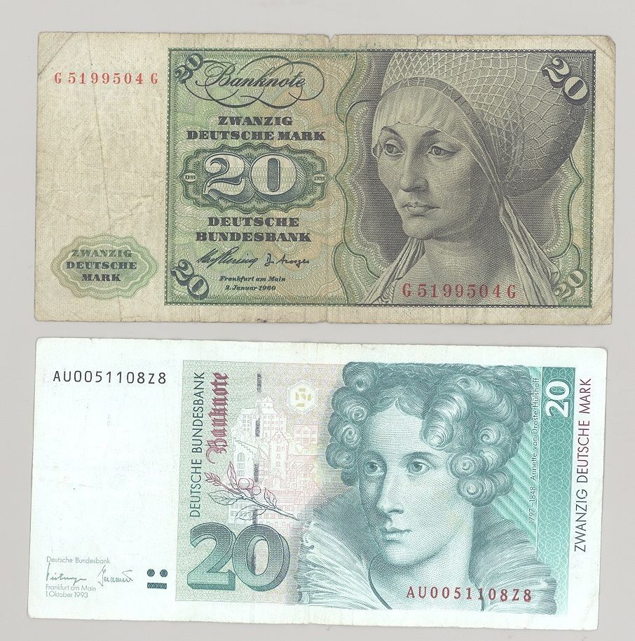 Deutschland, 13 x 20 DM Schein Bundesbank 1960 bzw. 1993 in verschiedenen Bedarfserhaltungen als Posten. 1 x der alte Schein, die anderen sind Bundesbank 1993. Der reine Geldwert beträgt 260,00 DM.