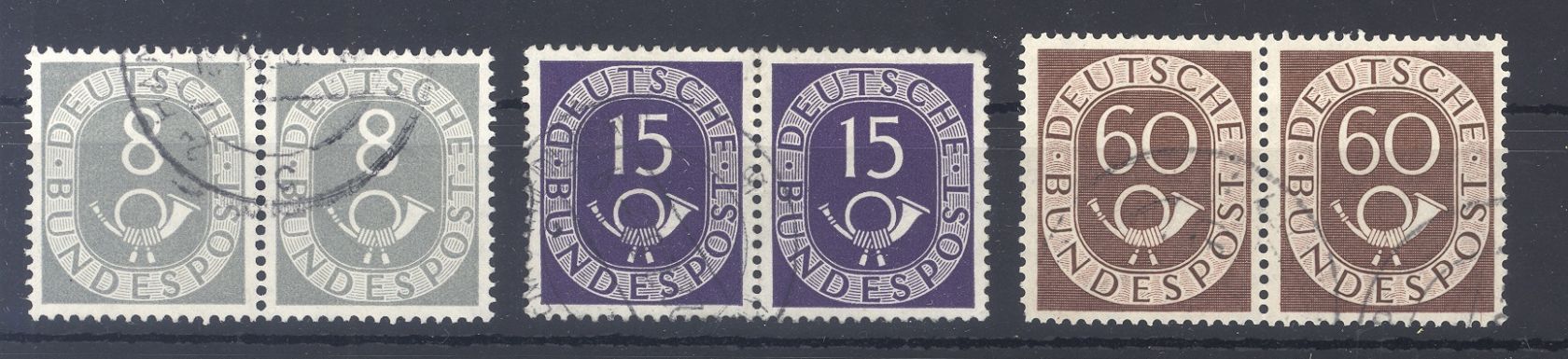 Bund, drei verschiedene gestempelte Posthorn Paare in Bedarfserhaltung als Posten. Es sind die 8 Pfg. , 15 Pfg. und 60 Pfg. Freimarken vorhanden,