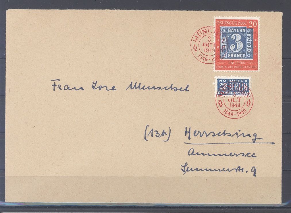 Bund, sauberer Brief frankiert Michel Nummer 114, 20 Pfg. 1949 als EF mit rotem SST aus München.