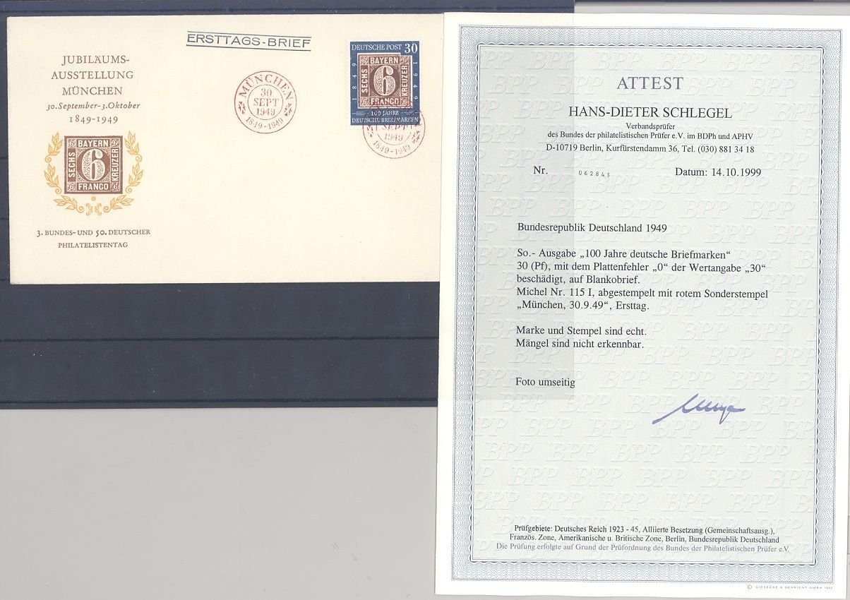 Bund, FDC Michel Nummer 115 I, 30 Pfg. 1949 mit dem Plattenfehler I. Es liegt ein FA BPP vor, ist mit eingescannt, hat bereits einiges gekostet, der normale Brief wertet bereits mit 500,00 Euro, und das ist sogar ein FDC ! Selten einmal angeboten!