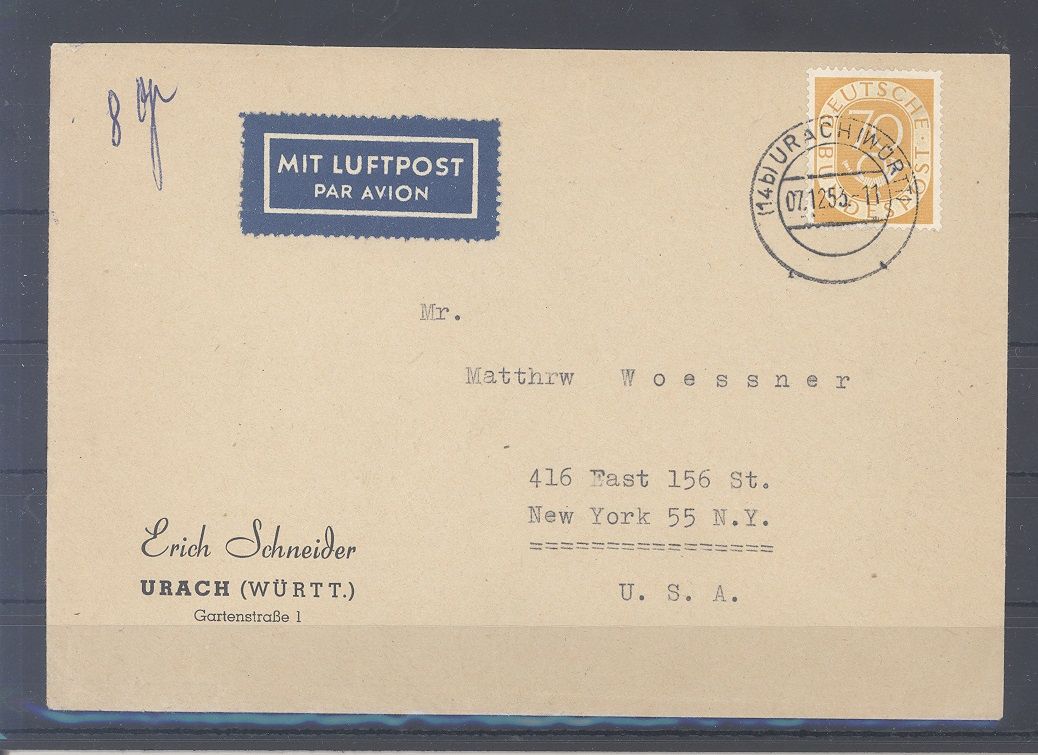 Bund, sauberer Luftpost Brief vom 7.12.1953 portogerecht frankiert mit 70 Pfg. Posthorn als EF in die USA gelaufen.