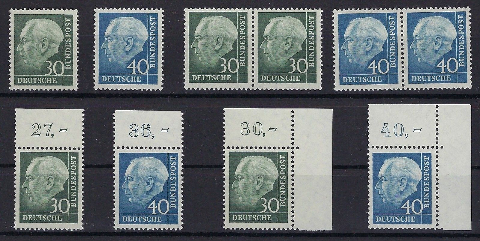 Bund Mi 259-60 y vierer Garnitur: normale Marken, waagerechtes Paar, Oberrand-Satz, Eckrand-Satz oben rechts