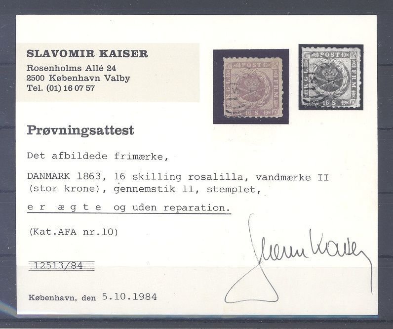 Dänemark Michel Nummer 10, 16 S. Kroninsignien 1863 gestempelt. Es liegt ein Befund Kaiser vor, ist mit eingescannt.