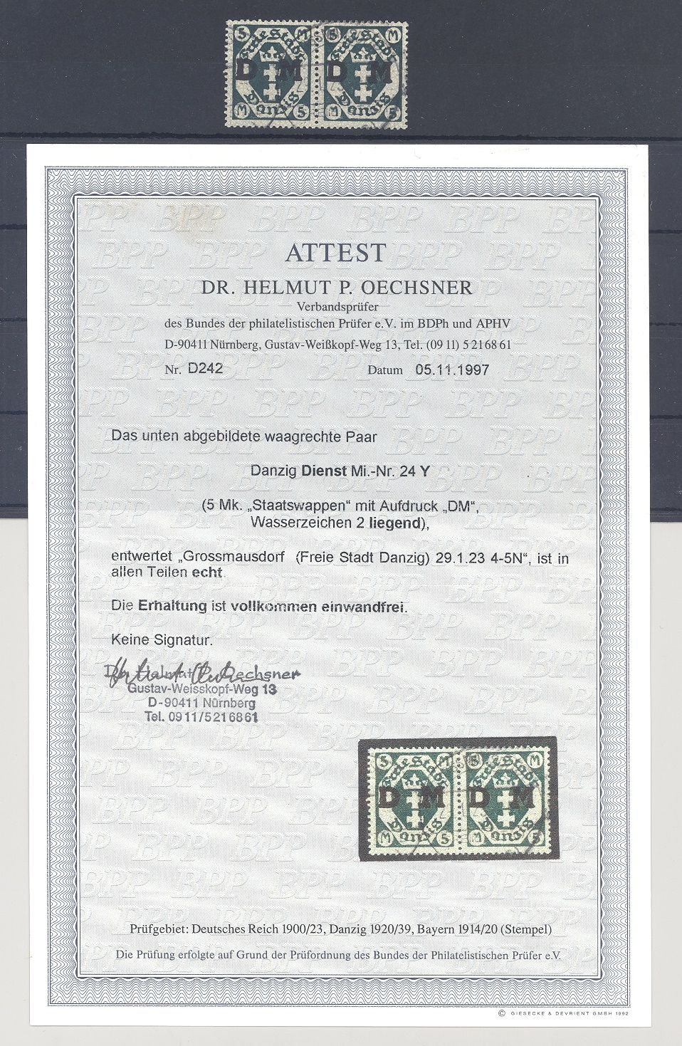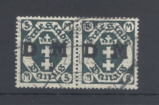 Danzig Dienst Michel Nummer 24 Y, 5 Mark Freimarke 1922 mit dem guten Wasserzeichen Y im gestempelten Paar, eine sehr schöne Einheit. Es liegt ein FA BPP vor, ist mit eingescannt, hat bereits einiges gekostet. Sehr interessant als Paar!