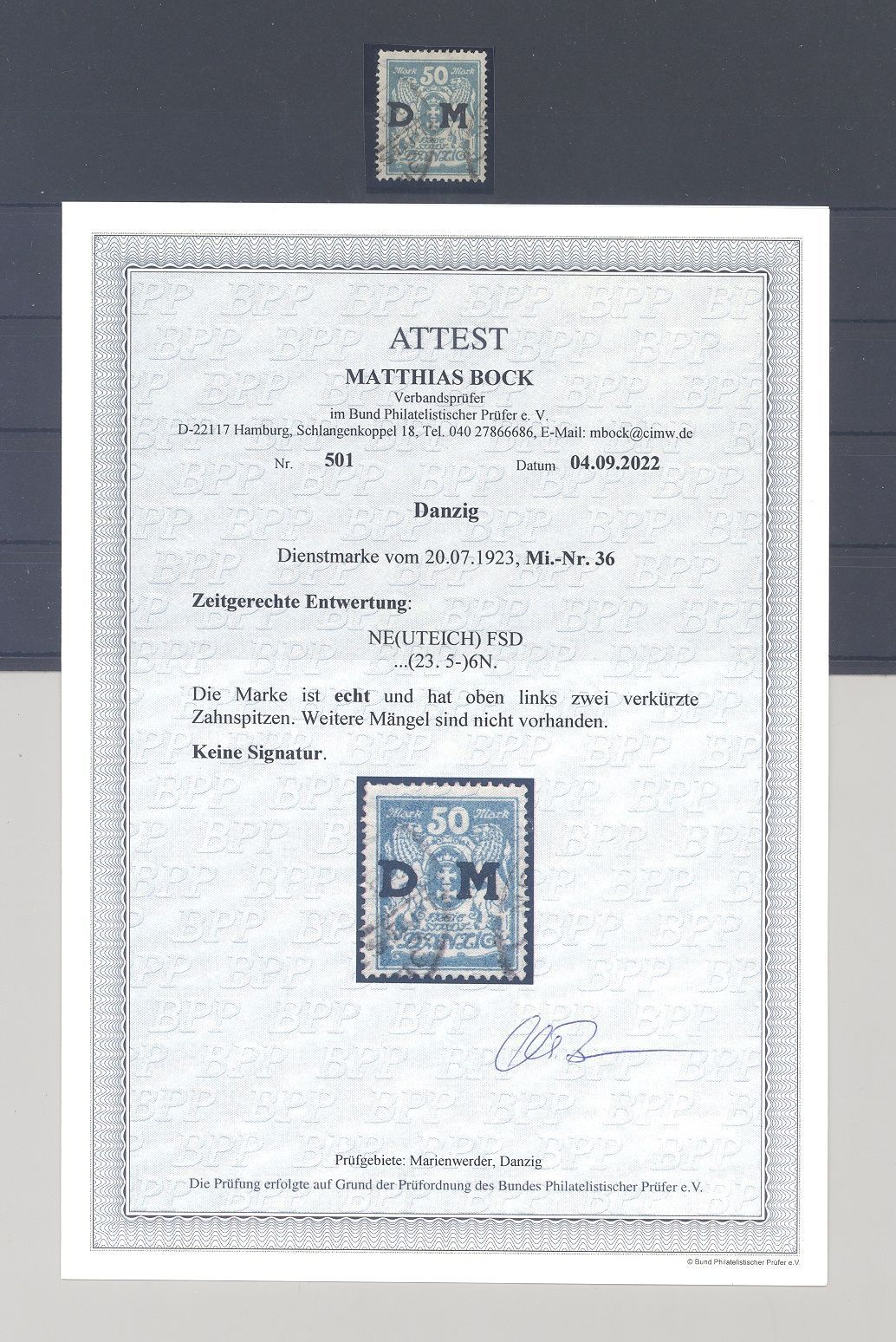 Danzig Dienst Michel Nummer 36, 50 Mark Freimarke 1923 gestempelt mit zwei leicht verkürzten Zahnspitzen, sonst ein sehr ordentlicher Wert. Es liegt ein FA BPP vor, ist mit eingescannt, hat bereits einiges gekostet.
