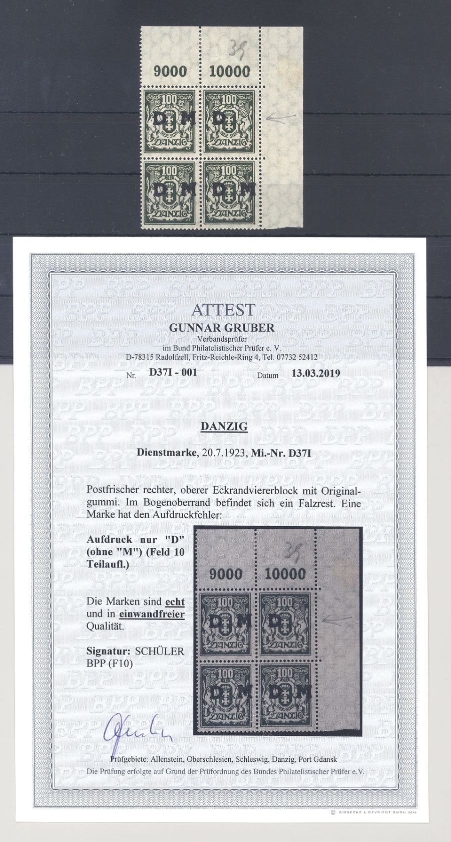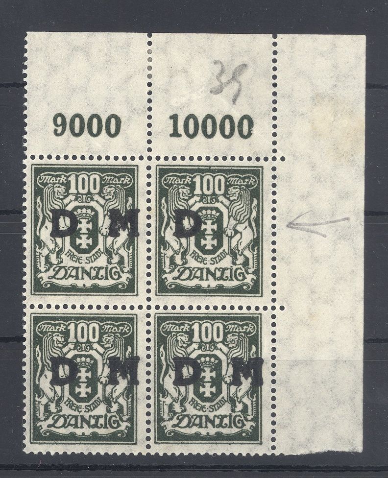 Danzig Dienst Michel Nummer 37 AF V, 100 Mark 1923 mit dem Aufdruckfehler V im ** Viererblock vom Eckrand mit drei Normalmarken. Es liegt ein FA BPP vor, ist mit eingescannt, hat bereits einiges gekostet.
