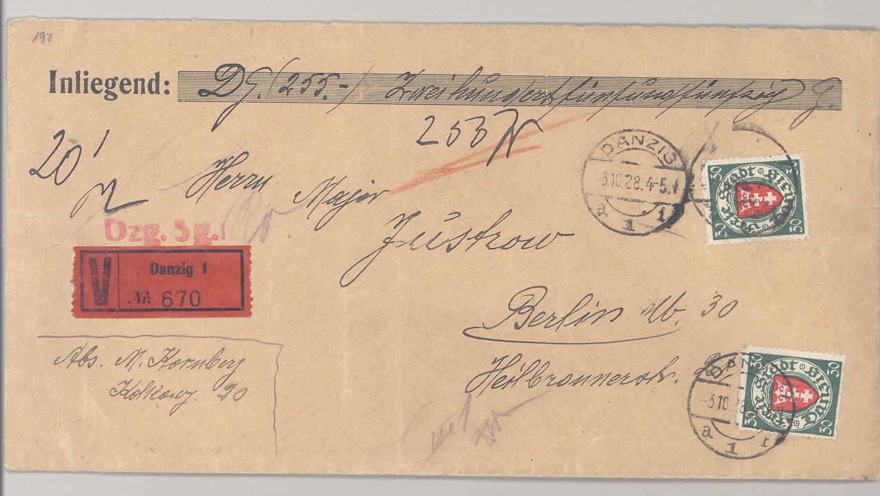 Danzig, interessanter Wertbrief frankiert mit 2 x 30 Pfg. Wappen als MeF aus Danzig nach Berlin mit rückseitigem Ankunftsstempel gelaufen.