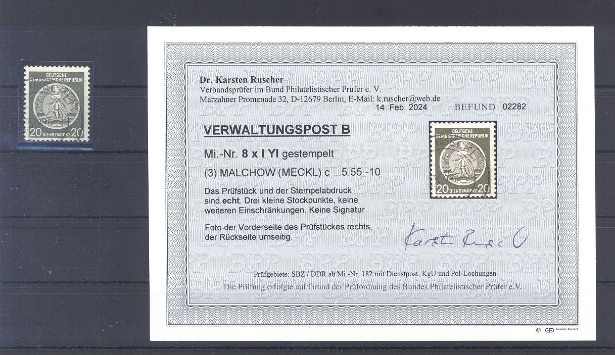 DDR Dienst A ZKD Michel Nummer 8 XI PF YI, die 20 Pfg. Freimarke in der guten Type YI gestempelt mit drei kleinen Stockpunkten, sonst und insgesamt ein sehr ordentlicher Wert. Es liegt ein Befund BPP vor, hat bereits einiges gekostet, ist mit eingescannt.