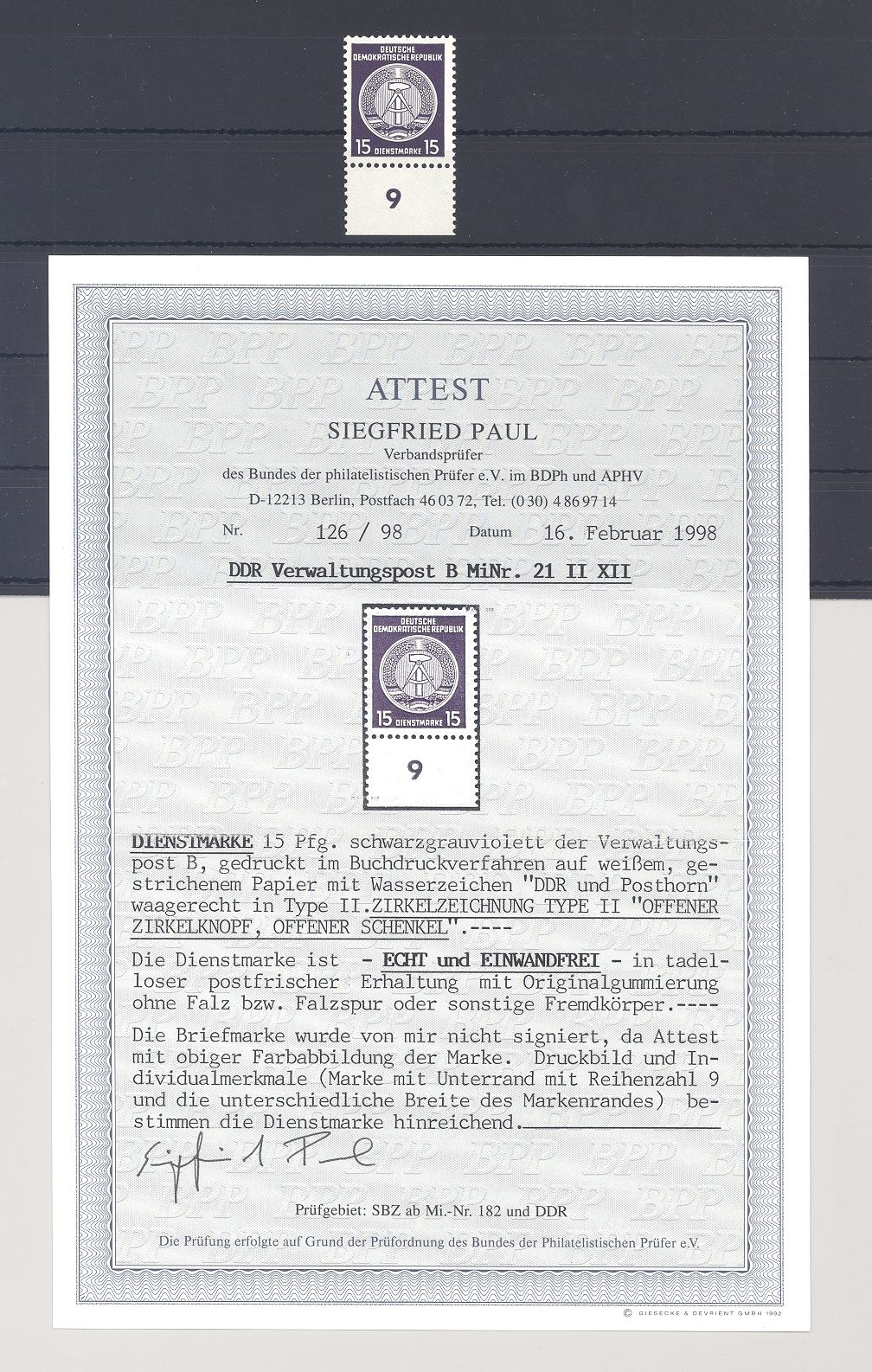 DDR Dienst Michel Nummer 21 xII / XII, 15 Pfg. Freimarke 1954/56 in der guten Type ** in sehr guter Erhaltung sogar vom Unterrand. Es liegt ein Befund BPP vor, hat bereits einiges gekostet, ist mit eingescannt.