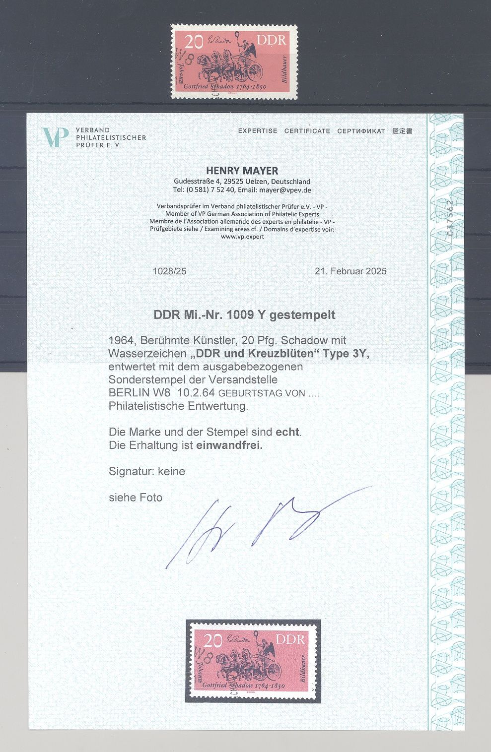 DDR Michel Nummer 1009 Y, 20 Pfg. 1964 mit dem gutem Wasserzeichen Y gestempelt, der Michel beträgt nur -,-. Es liegt ein FA Mayer vor, ist mit eingescannt.