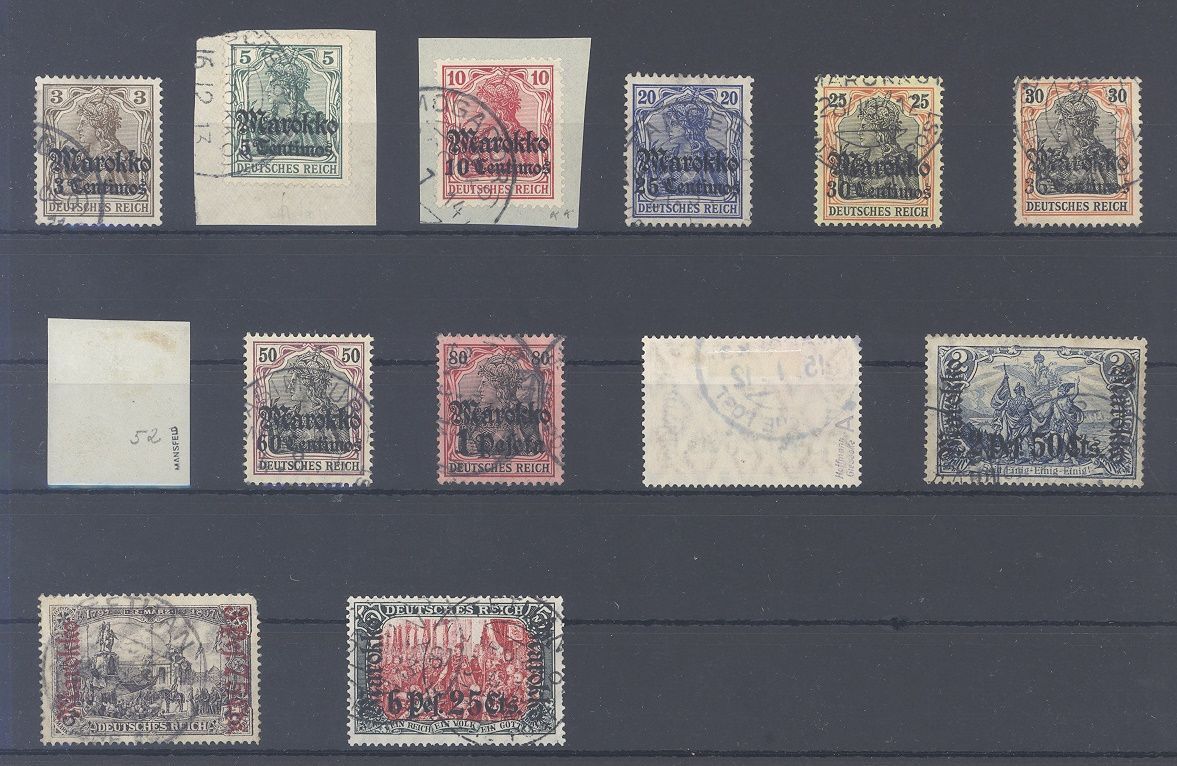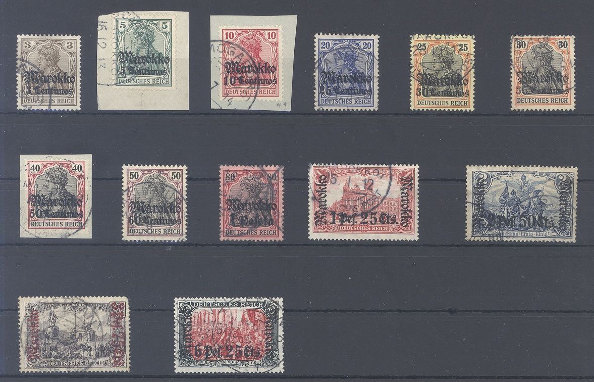 Deutsche Post Marokko Michel Nummer 46/58, Freimarken 1911 gestempelt in etwas unterschiedlicher, insgesamt doch ordentlicher Erhaltung.