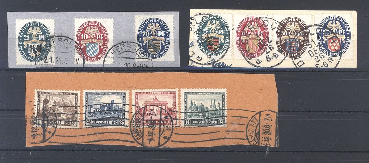 Deutsches Reich, drei verschiedene Nothilfesätze auf Briefstücken. Es sind die Michel Nummern 375/77, 398/401 und 450/53 vorhanden. Nette Ergänzung zur Sammlung.