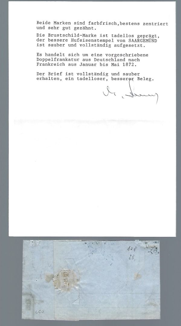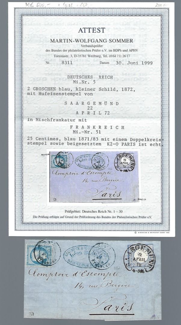 DR Auslandsbrief mit DR Mi 5 und Frankreich Mi 51, mit Hufeisenstempel Saargemünd, befördert nach Paris