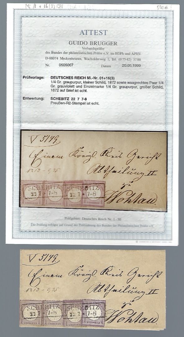 DR Mi 1 (3) davon einmal als Paar und Mi 16, MiF mit Ra2 Schebitz (Preußen Nachverwendung, befördert nach Wehlau, Mit FFA Brugger BPP