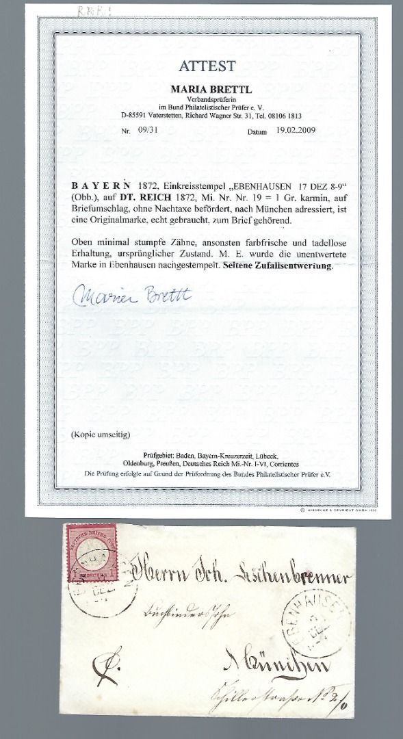 DR Mi 19 als EF nach München befördert, der Brief wurde ohne Nachgebühr befördert und in Ebenhausen entwertet. Seltene Zufallsentwertung.