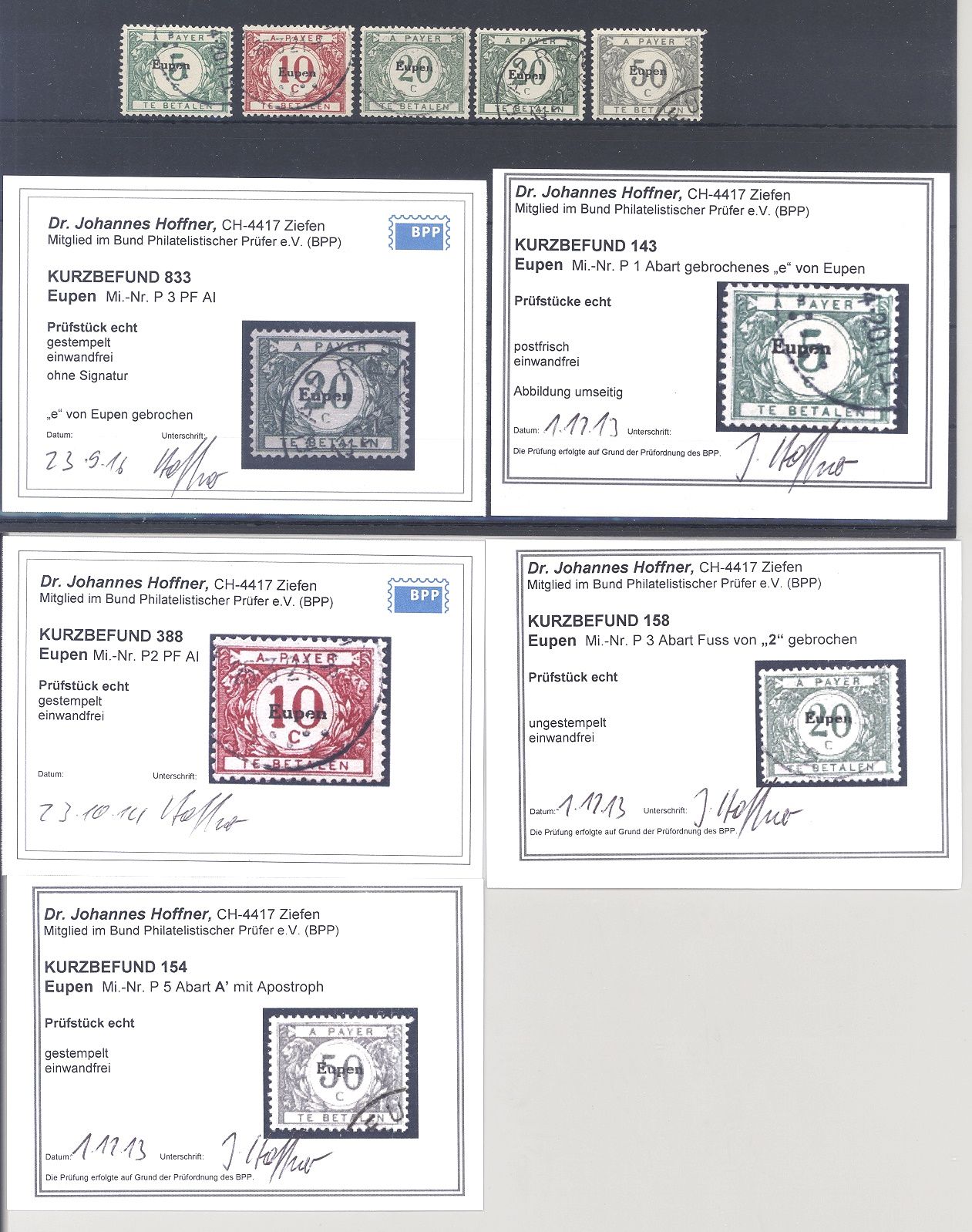 Deutsche Abstimmungsgebiete Eupen Portomarken, sehr interessanter gestempelter Posten verschiedener Abarten. Es liegen fünf Kurzbefunde BPP vor, sind mit eingescannt, haben bereits einiges gekostet. Tolle Ergänzung zur Sammlung!