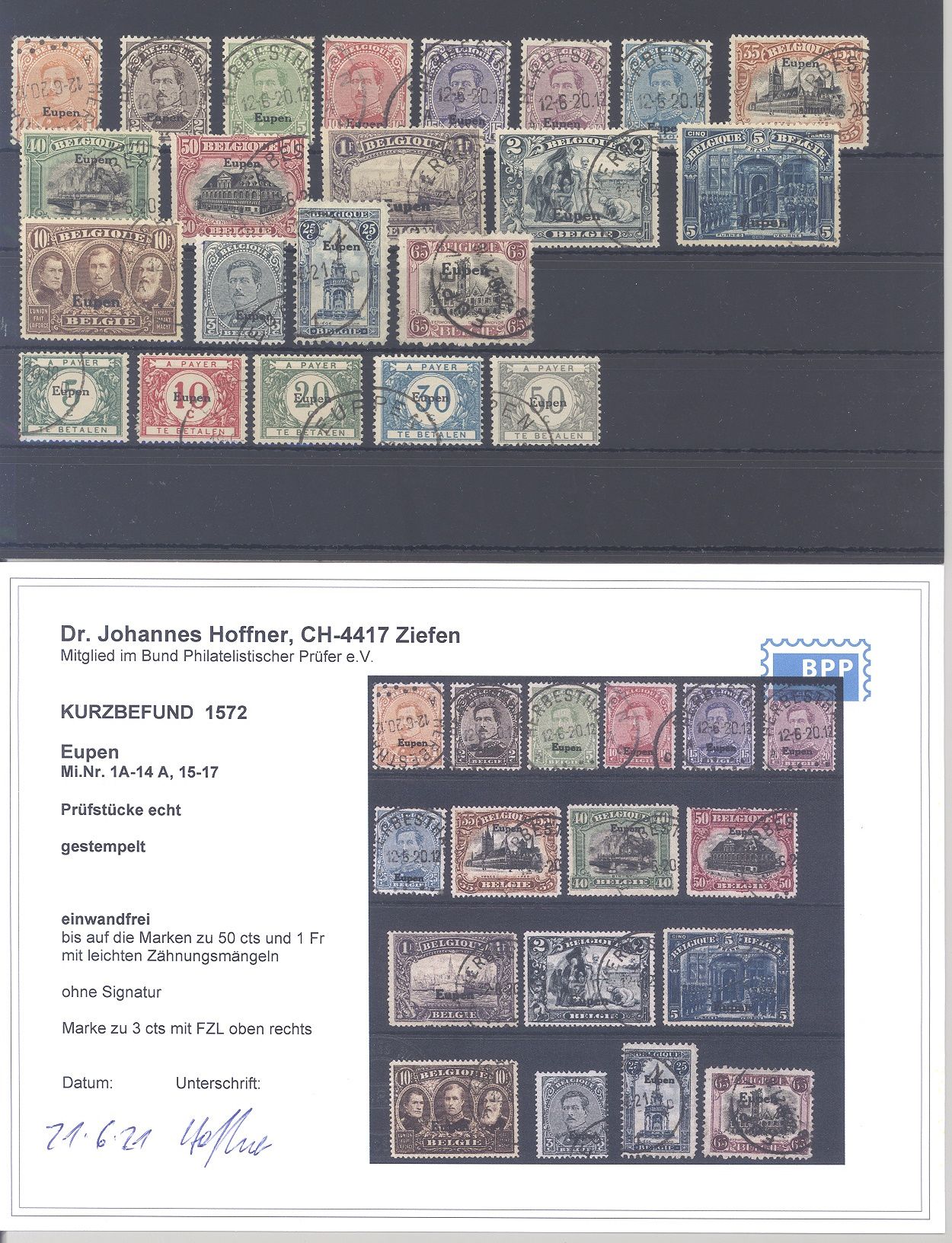 Deutsche Abstimmungsgebiete Eupen Michel Nummer 1/17, Freimarken 1920 und Porto Michel Nummer 1/5 gestempelt. Es liegt ein Befund BPP vor, hat bereits einiges gekostet, ist mit eingescannt,
