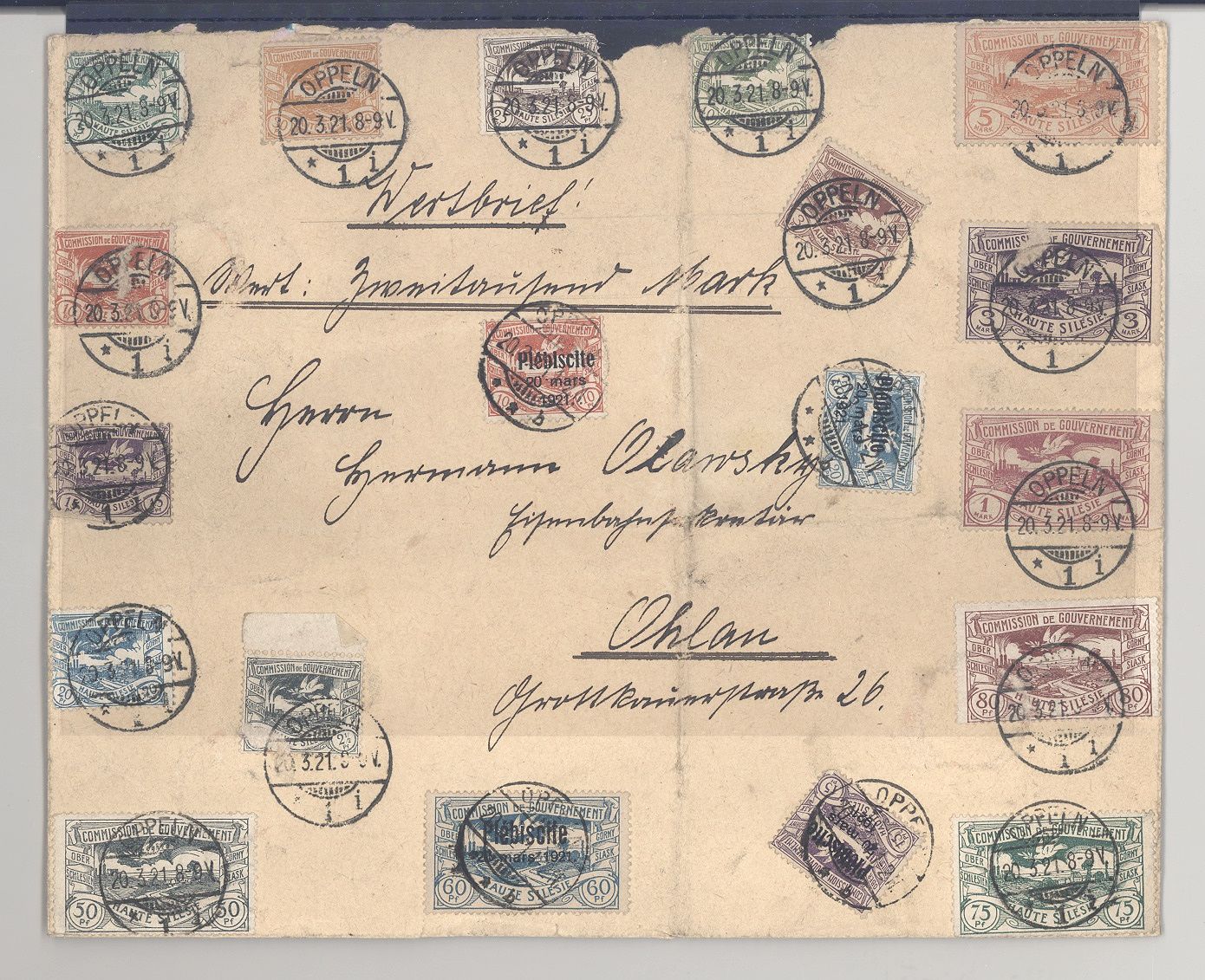 Deutsche Abstimmungsgebiete Oberschlesien, großer Brief mit Mängeln, aber umfangreicher Frankatur. Nette Ergänzung zur Sammlung.