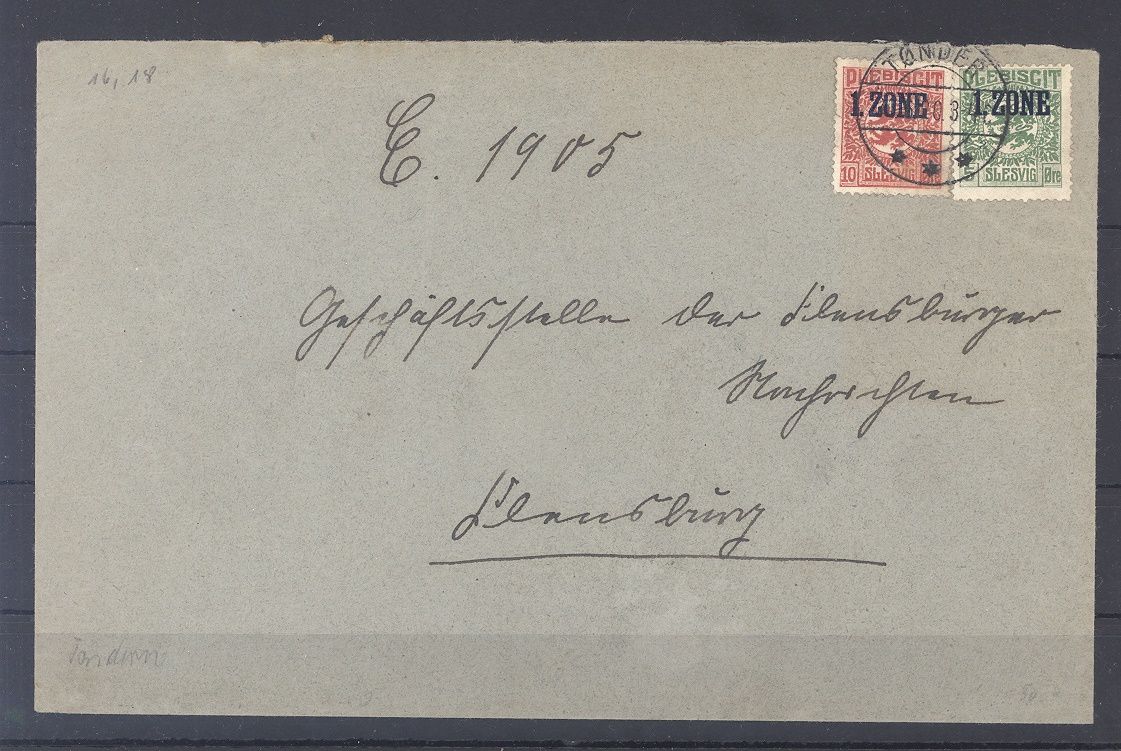 Deutsche Abstimmungsgebiete Schleswig, interessanter Brief frankiert mit 5+ 10 Ö. MiF aus der 1. Zone Ausgabe aus Tonder gelaufen. Nette Ergänzung zur Sammlung.