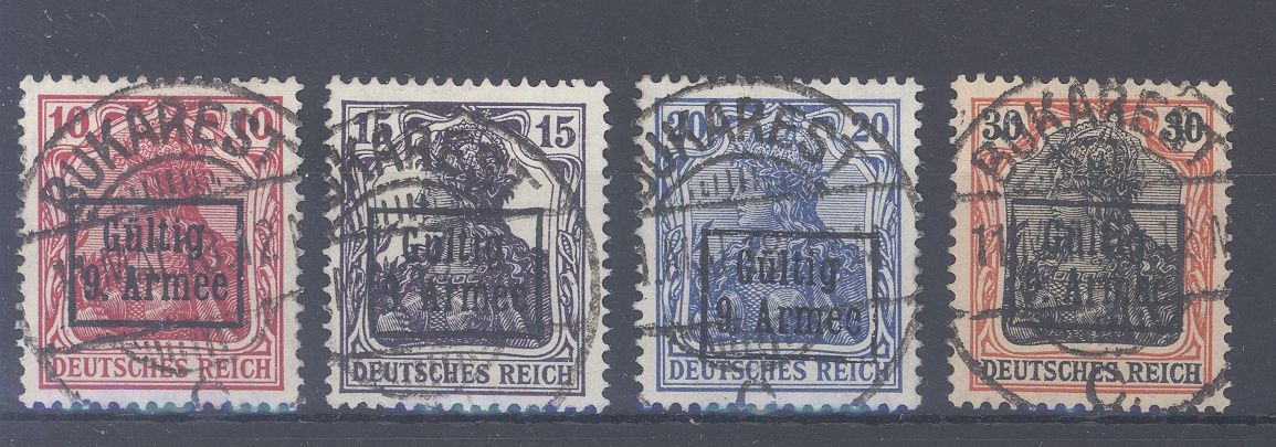 Deutsche Besetzung 1. WK, Etappengebiet 9. Armee Michel Nummer 1/4, Freimarken 1918 gestempelt.