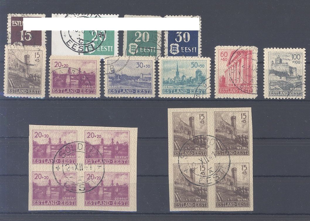 Deutsche Besetzung 2. WK Estland Michel Nummer 1/9, Freimarken 1941 überkomplett gestempelt und dazu noch drei gestempelte ungezähnte Viererblöcke.