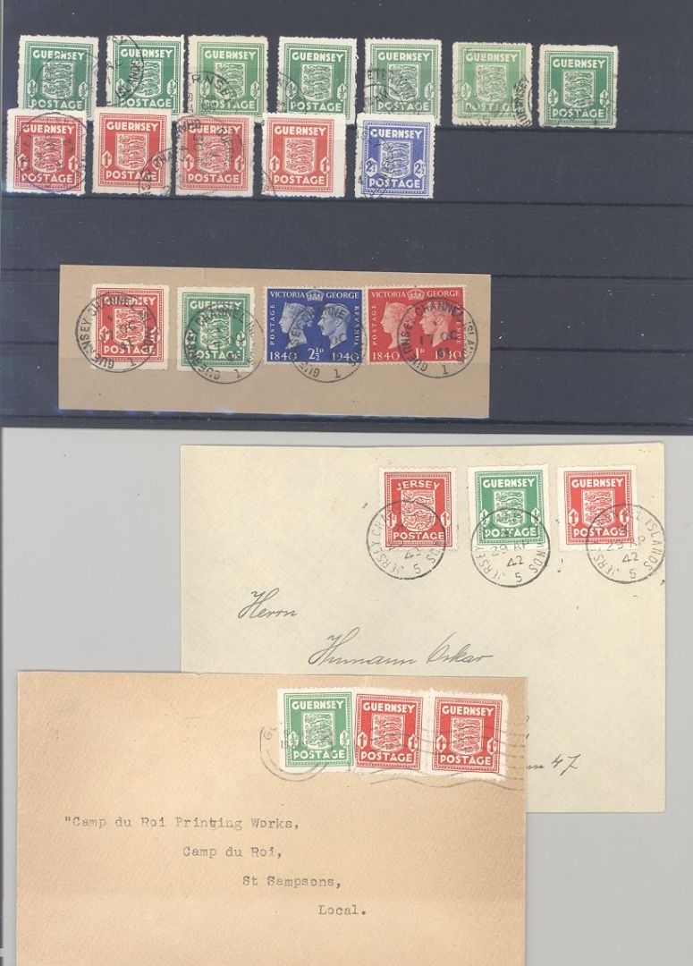 Deutsche Besetzung 2. WK Kanalinseln Guernsey, /gestempelter Posten mit auch zwei Briefen, einfach zusammengesteckt. Sollte ein nettes Schäppchen sein