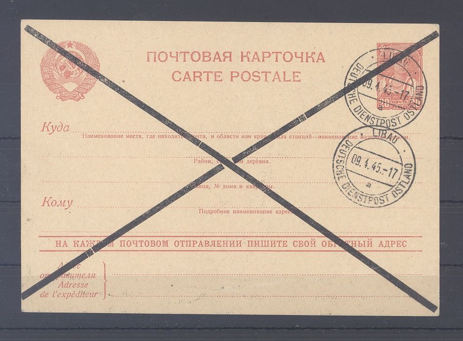 Deutsche Besetzung 2. WK Kurland, interessante gestempelte russische GA aus Libau vom 9.4.1945 als Formblatt zur Rundfunkgenehmigung. Nette Ergänzung zur Sammlung!