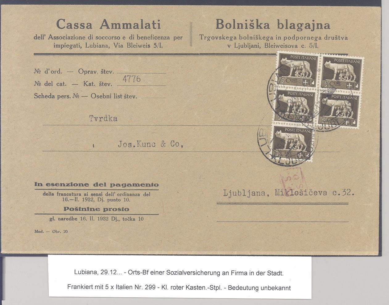 Deutsche Besetzung 2. WK Laibach, interessanter wohl Zensur Dienstbrief frankiert mit 5 x Italien 299 aus Lubiana gelaufen. Nette Ergänzung zur Sammlung.