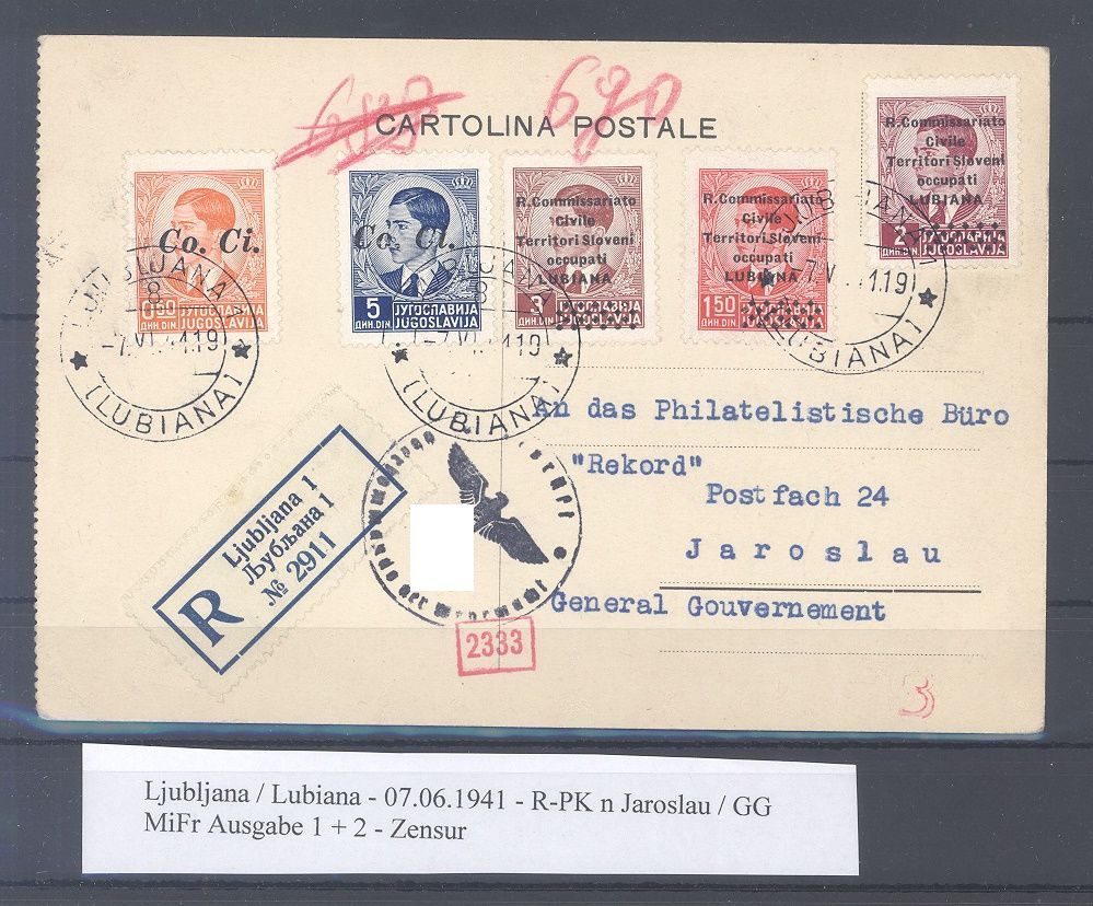 Deutsche Besetzung 2. WK Laibach, saubere Sammlerkarte aus dem Jahr 1941 frankiert mit interessanter MiF aus Lubiana nach Jaroslau mit rückseitigem Ankunftsstempel gelaufen. Nette Ergänzung zur Sammlung.
