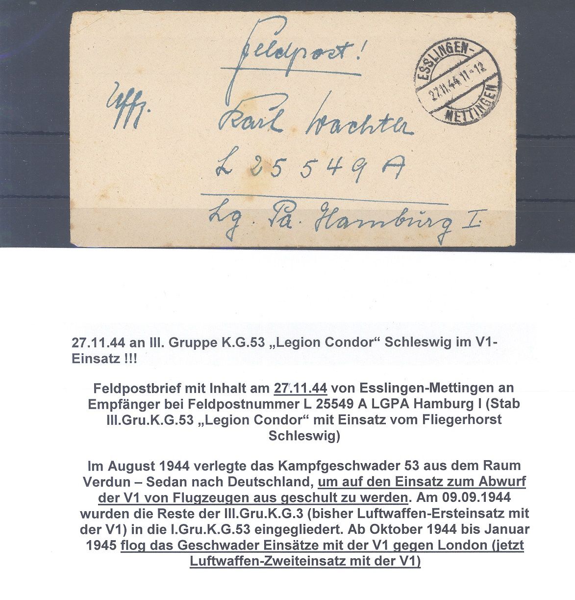 Deutsche Feldpost 2. WK, sauberer Brief vom 27.11.1944 von der Gruppe "Legion Condor" im V1 Einsatz aus Esslingen. In dieser Zeit flog das Geschwader Einsätze mit der V1 gegen London.