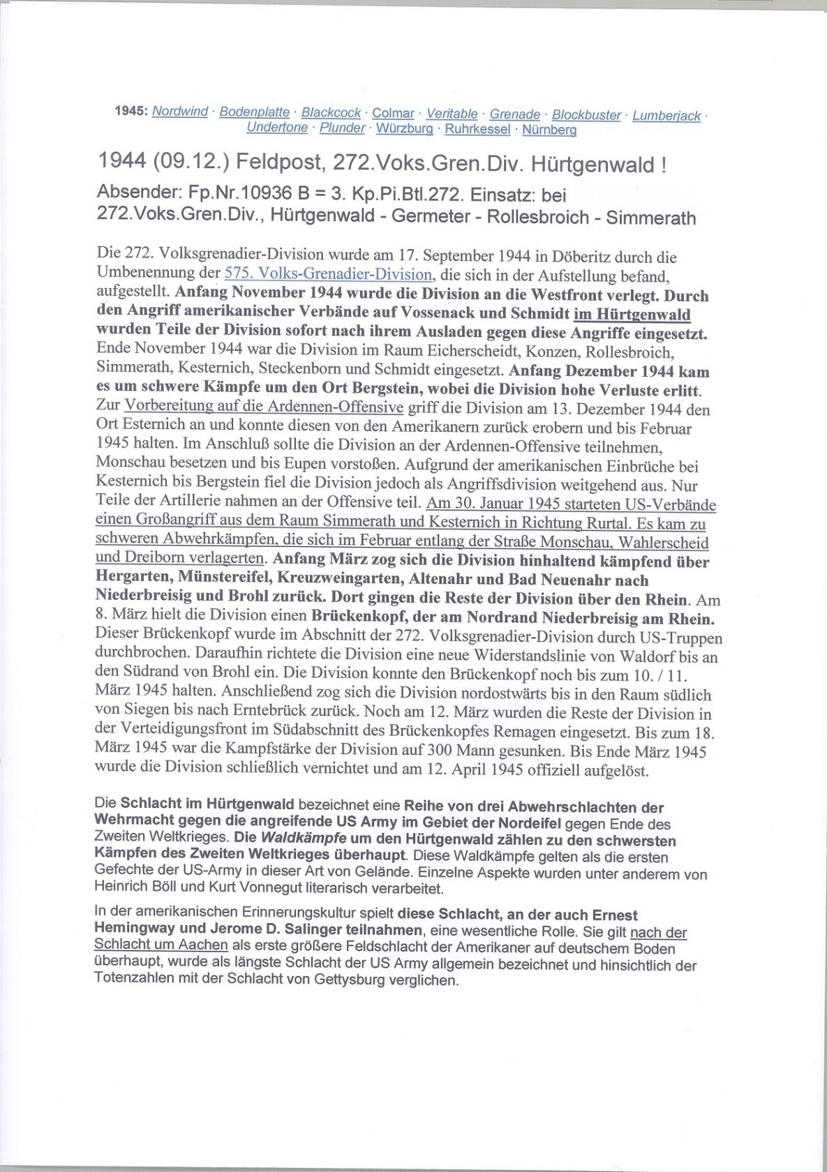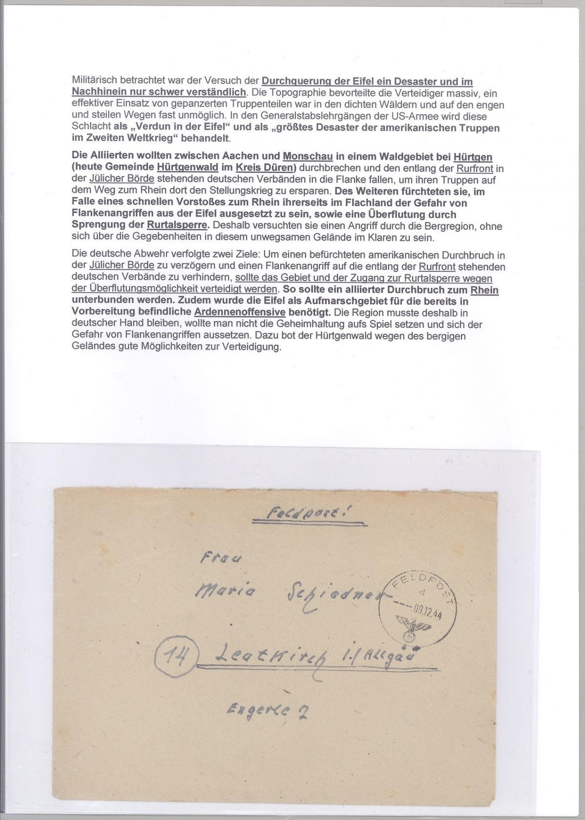 Deutsche Feldpost 2. WK, sauberer Feldpost Brief aus dem Jahr 1944 von der Schlacht im Hürtgenwald mit zusätzlich umfangreichen Informationen auf 4 Blättern.