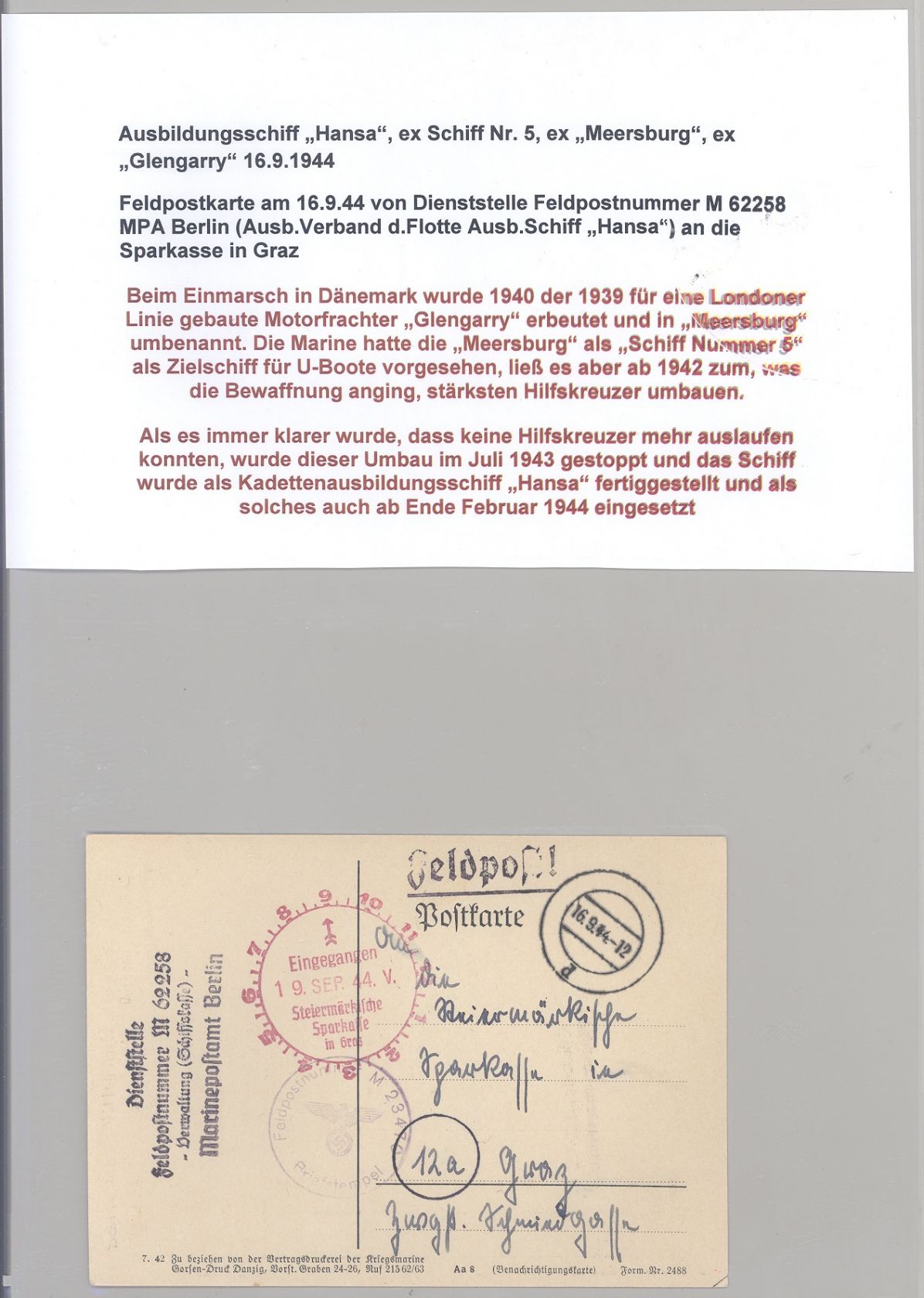 Deutsche Feldpost 2. WK, saubere Karte vom 16.9.1944 vom Ausbildungsschiff Hansa nach Graz gelaufen.