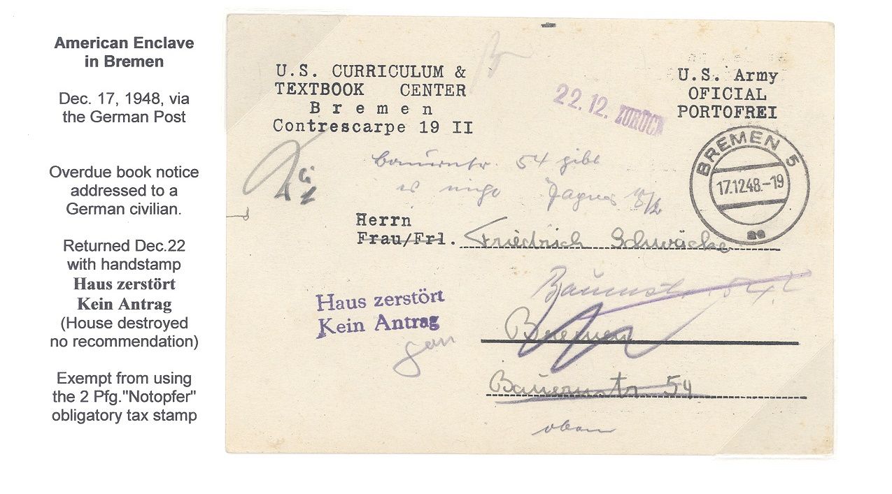 Deutsche Feldpost 2. WK, saubere US Feldpost Karte vom 17.12.1948 zurück mit Zweizeiler "Haus zerstört, kein Antrag" gelaufen.